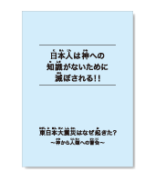 「なぜ東日本大震災は起きたの?」「どうしてこんなことになるの?」聖書には、今の日本、世界の現状、この世で起こりうる問題の解答、さらには未来に起きることまでが全て書かれてあります。しかし、日本人は、聖書(=真の神)を知る知識がなかったがために、真の神を怒らせ、自ら滅びをまねいてきてしまいました。この冊子を通して、今こそ日本人が、神からの警告をしっかりと受け止め、あらゆる偽の神々、宗教、カルトから解放されて、真の神イエス・キリストに立ち返ることができるようにと祈ります。